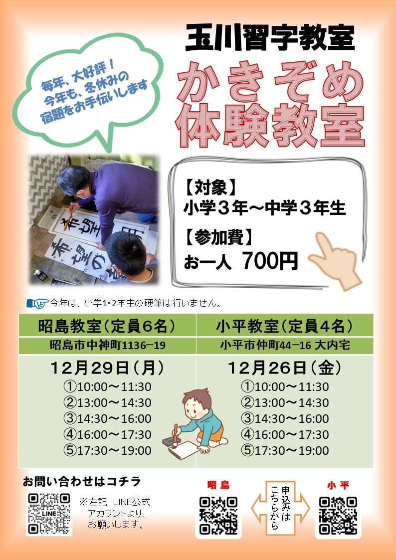 かきぞめの宿題体験教室 12/1(月)午前8時より受付開始‼